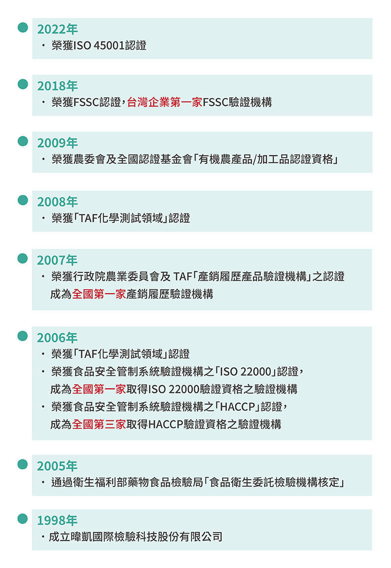 「FSI 暐凱國際檢驗科技股份有限公司」於1998 年創立,為國際 FSI 食品安全檢驗機構(FS International-Asia Pacific Office) 亞太地區分支,秉持著「專業、公正、服務、效率」的精神提供專業檢驗服務。
