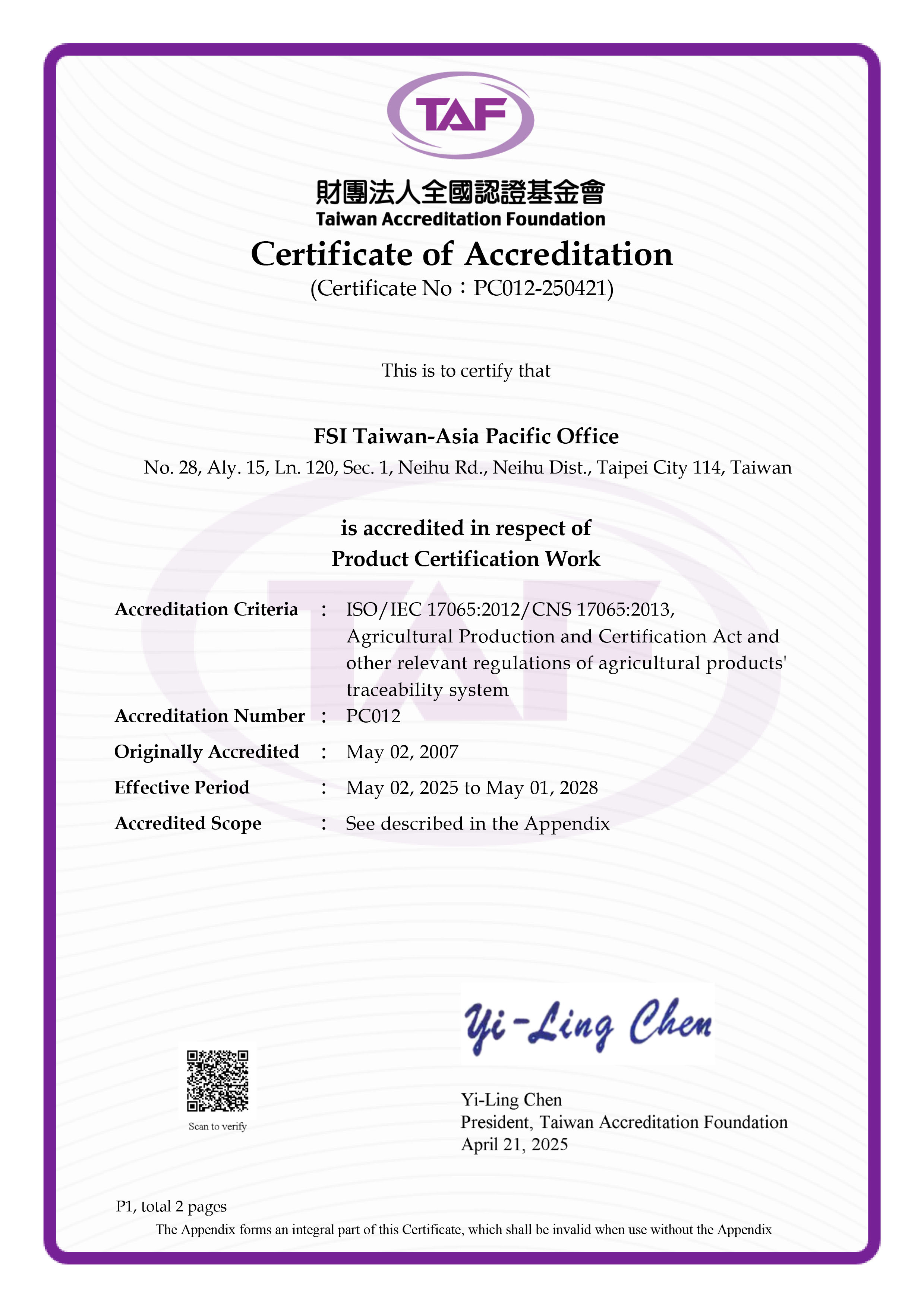 農業產品正面臨全球化競爭壓力的同時,消費結構型態亦日趨轉變,為落實永續農業精神,使台灣農業更具活力與競爭力,農產品的源頭管理和衛生安全更須嚴格審 視,同時以止息層出不窮的農產品安全問題。有鑑於此,行政院農委會於2007年起相繼通過「農產品生產及驗證管理法」、「產銷履歷農產品驗證管理辦法」等 相關法規,為我國農產品安全管理開啟新頁。FSI暐凱國際自2007年5月2日獲全國認證基金會頒發證書,成為我國第一家通過認證的產銷履歷農產品驗證機構。