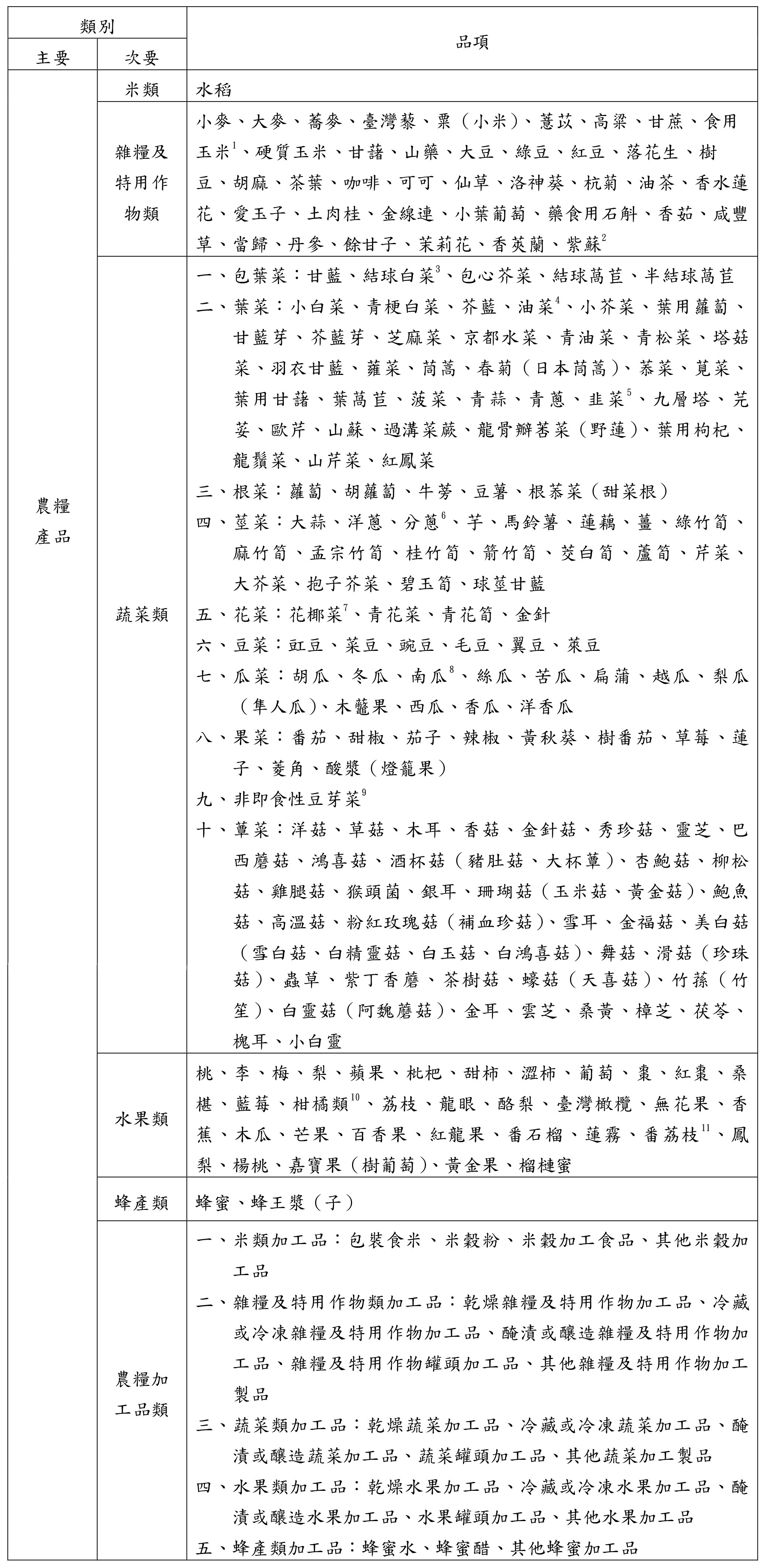 | 畜禽加工品類 | 1 | 家畜類加工品:豬副產品加工、熟肉、豬肉香腸、豬肉松、豬肉貢丸、培根、火腿、豬肉乾、鹹豬肉、臘肉、牛肉精、牛肉貢丸 | |