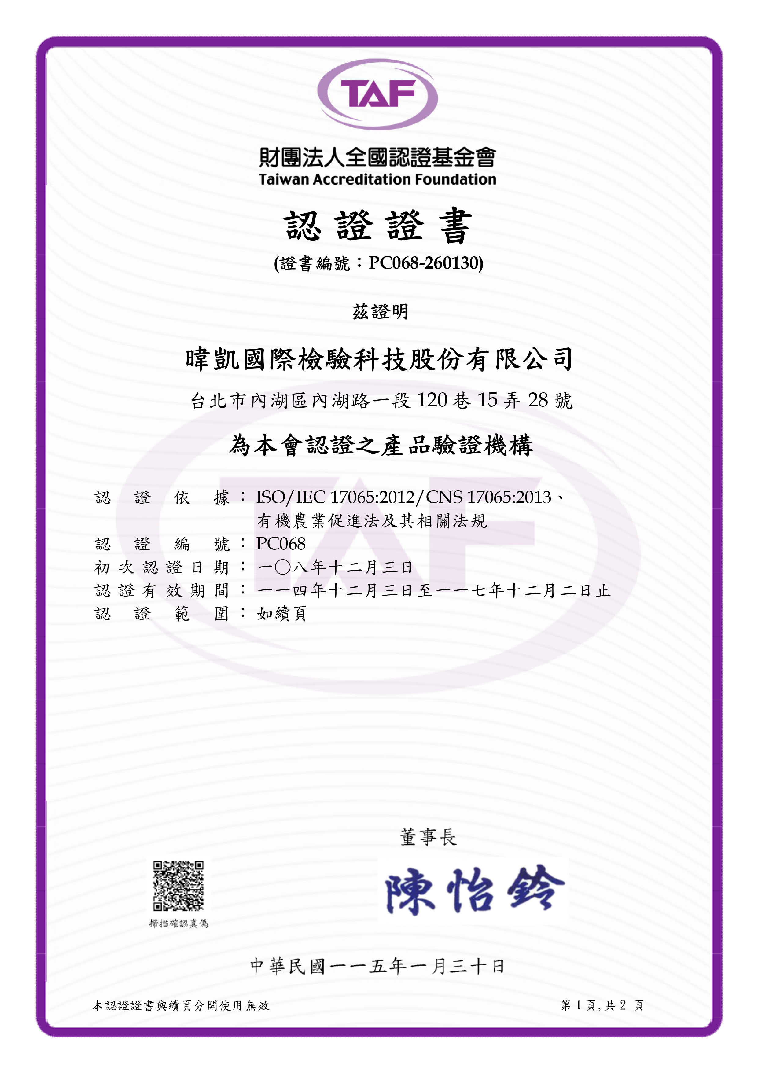 財團法人全國認證基金會有機農糧產品及有機農產加工品 驗證機構認證證書 |