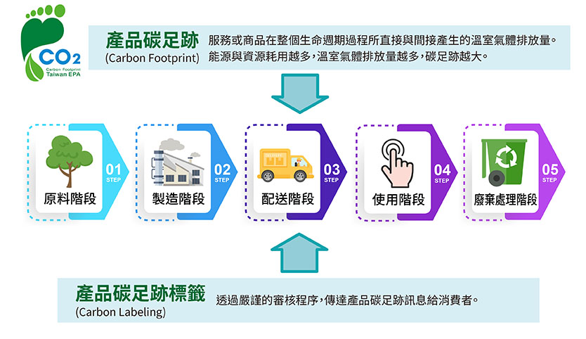 根據行政院環保署公告,所謂的「產品碳足跡」是指由商品原料取得、製作、配送銷售、使用與廢棄處理等產品生命週期過程中,所產生之溫室氣體的排放量,並經由正確換算後為二氧化碳當量之總和。