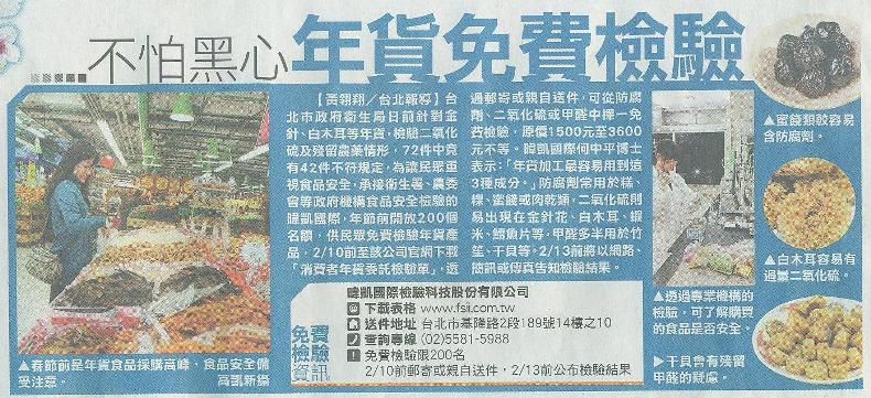 | 2010-02-01 | 蘋果日報讀者有福囉~ FSI暐凱公司提供消費者免費檢驗服務,讓您安心過好年! |
