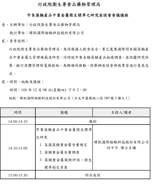 市售藻類產品中重金屬衛生標準之研究座談會會議議程