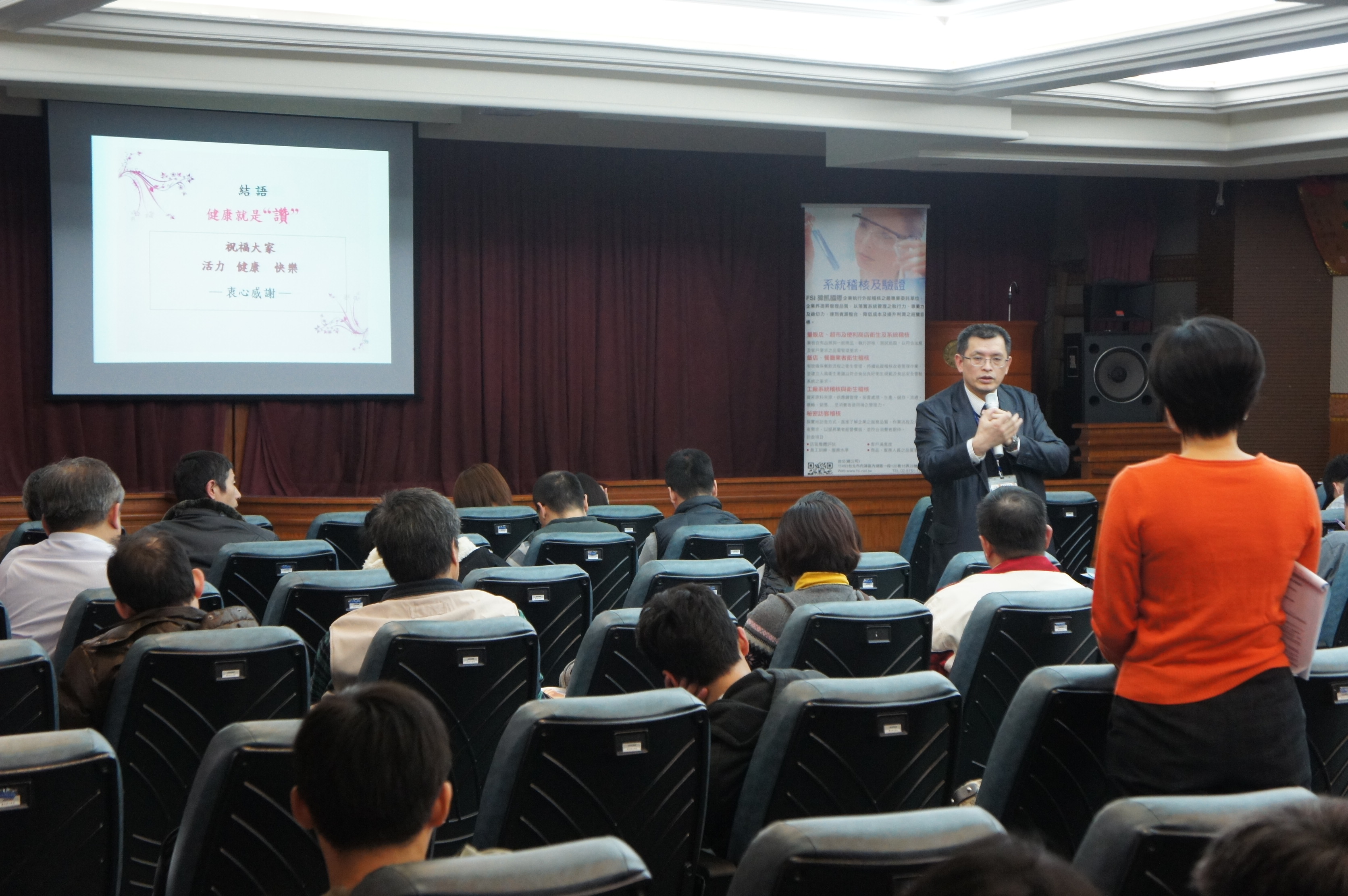 FSI暐凱國際與台中市政府衛生局共同辦理『中區食品安全講座』,為食品從業人員講解新修正的食品衛生管理法案,以及如何透過食品管制系統來增強食品安全管理。 圖:暐凱國際何博士講解「新修正食品衛生管理法」 圖: 學員們認真筆記台上老師分享的案例 圖: 台中市衛生局陳科長解答學員提問 圖: 何博士、陳科長與學員互相交流意見 |