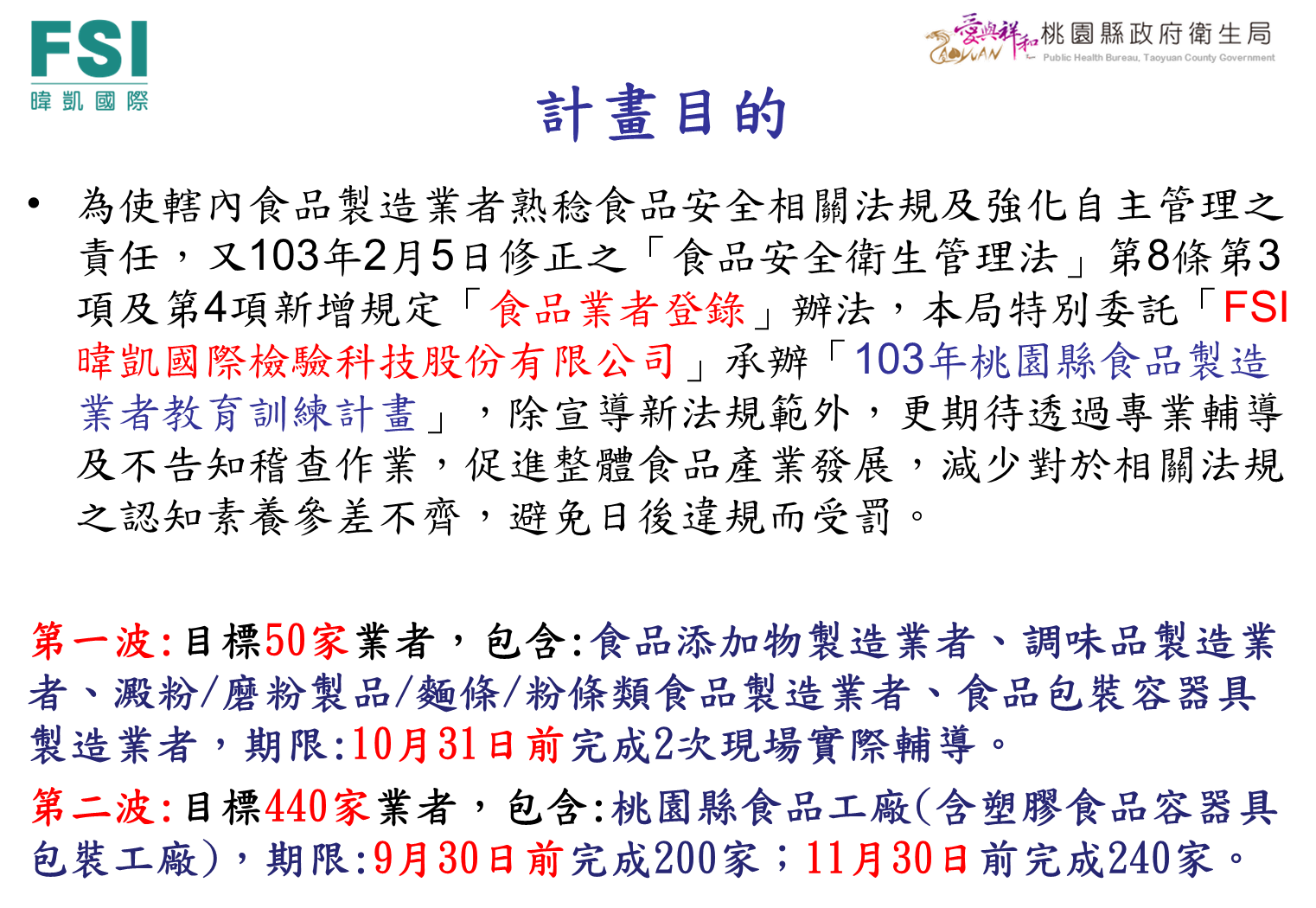 103年桃園縣地區食品製造業者食品衛生安全法規講習-8月份圓滿完訓,現場實際輔導及查核陸續展開,第一波50家業者,第二波440家業者,桃園地區食品製造業夥伴們,一起為食品安全共同把關吧!!