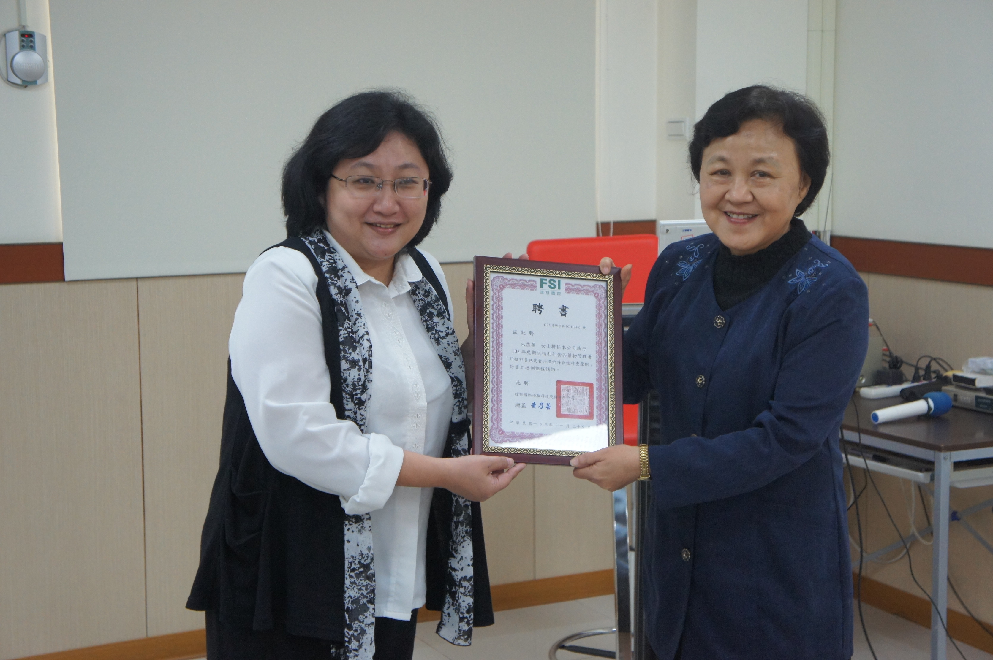 註: 頒發「研擬市售包裝食品標示符合性稽查原則」講師聘書;左-FSI暐凱國際 黃乃芸博士;右-食工所 朱燕華主任