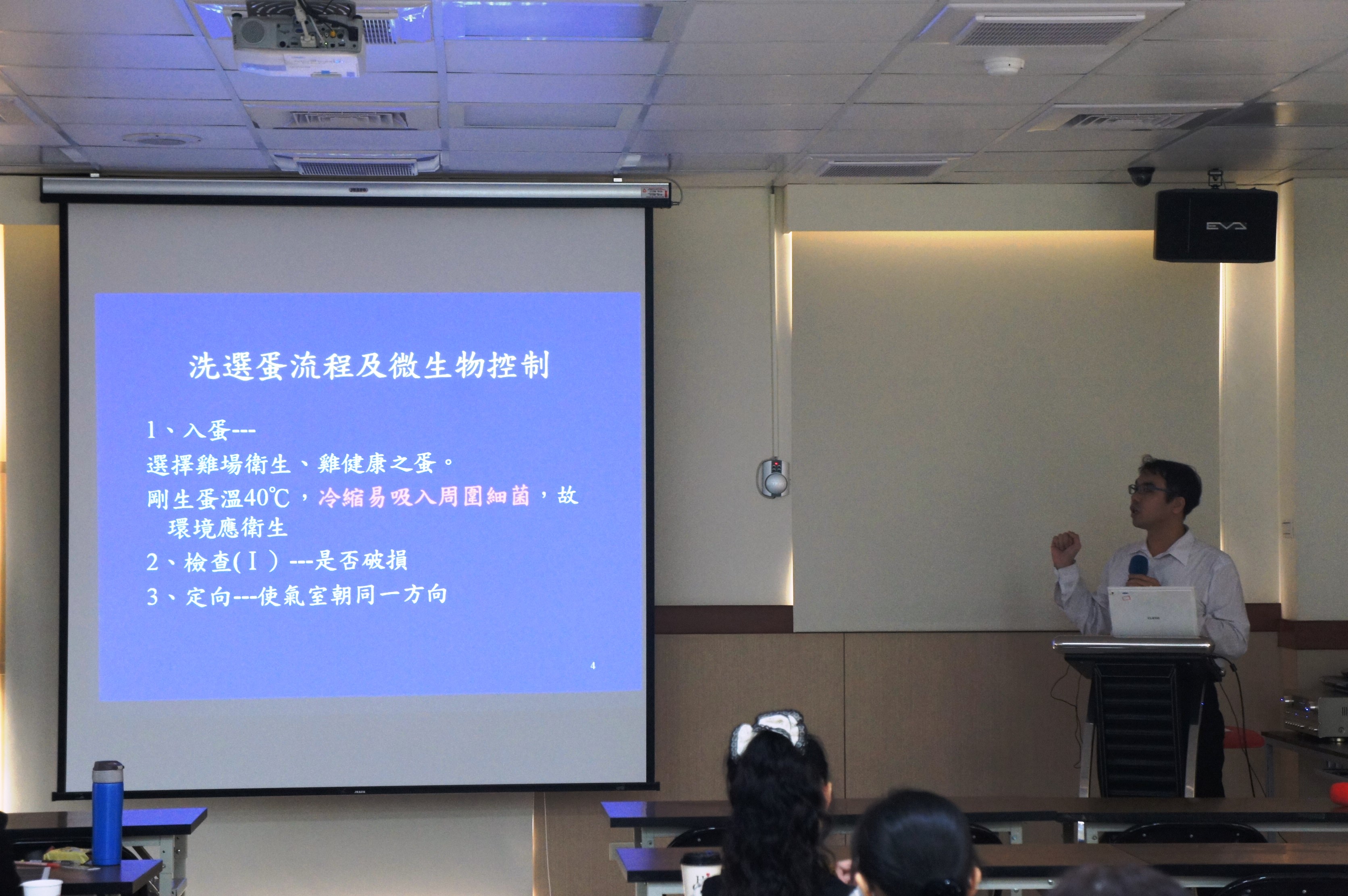 蛋品課程則由稽查經驗豐富的鐘文淇經理授課,課程中作蛋品生產包裝製程及產業管理模式解說,並與學員分享相關稽查實務及案例。